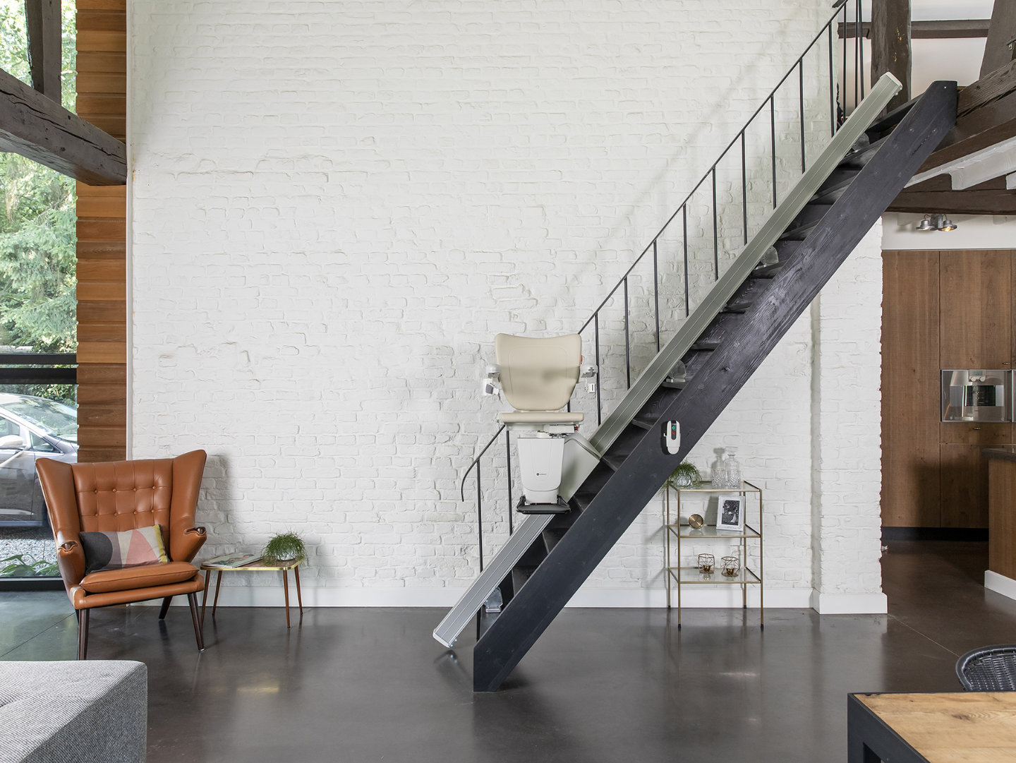 La rotaia retrattile (slide track) del montascale Handicare 1100 stairlift è un sistema che scorre automaticamente per liberare lo spazio vicino a una porta o a un passaggio.